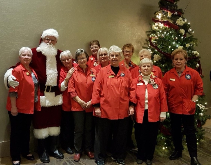 Jolly Santa greets Chilliwack Auxiliary volunteer at a breakfast event hosted by the Fraser Valley Health Care Foundation.