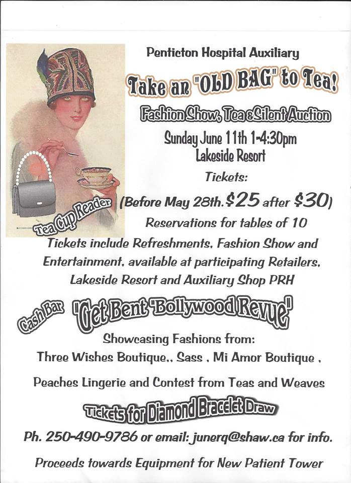 Close to 300 people attended the “Take an Old Bag to Tea” event on Sunday, June 11 — much to the Penticton Hospital Auxiliary’s delight. Their fifth annual fashion show fundraiser began with Auxiliary president Nancy Leardo surprising Carey Bornn of the SOS Medical Foundation with a $50,000 donation. The Auxiliary has now raised more than $147,000 towards its incredible $250,000 pledge to the Foundation’s campaign to supply the medical equipment for the PRH expansion now well underway.